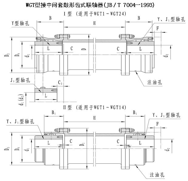WGT型接中間套鼓形齒式聯(lián)軸器基本參數(shù)和主要尺寸(JB/T 7004一93)/mm